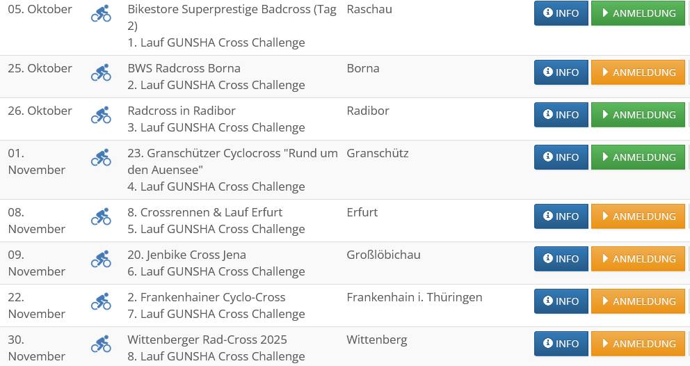 Ein Mix aus puristischem Spirit und professioneller Organisation – die Gunsha CX Challenge bringt Einfachheit und Qualität auf den Punkt. Ob erfahrener CX-Crack oder Adrenalinjunkie – bei uns findest du Rennen für alle Klassen, inklusive spannender Jedermann-Rennen.