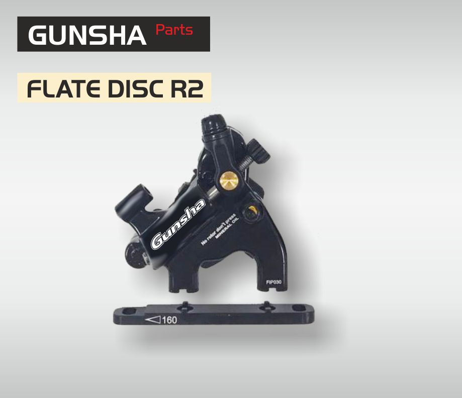 Die Gunsha CX R2 Disc Semi-Hydraulikbremse (für Flatmount Bremsaufnahmen) wird mechanisch angesteuert. Der Doppelkolben-Bremssattel basiert jedoch auf einem Mineralöl-Hydrauliksystem. Ein Kolben überträgt den Druck gleichmäßig auf die beiden Bremssättel. Ein weiterer Vorteil besteht darin, dass der Druckpunkt variabel einstellbar ist, und die Hebelwirkung sowie die Bremshebelweite individuell angepasst werden können. Dies bietet besonders Vorteile bei unterschiedlichen Bremshebeln. Das Gewicht beträgt inklusive des 3D-Adapters etwa 170 Gramm (ohne Adapter etwa 160 Gramm). Der Bremskörper besteht aus Aluminium.
